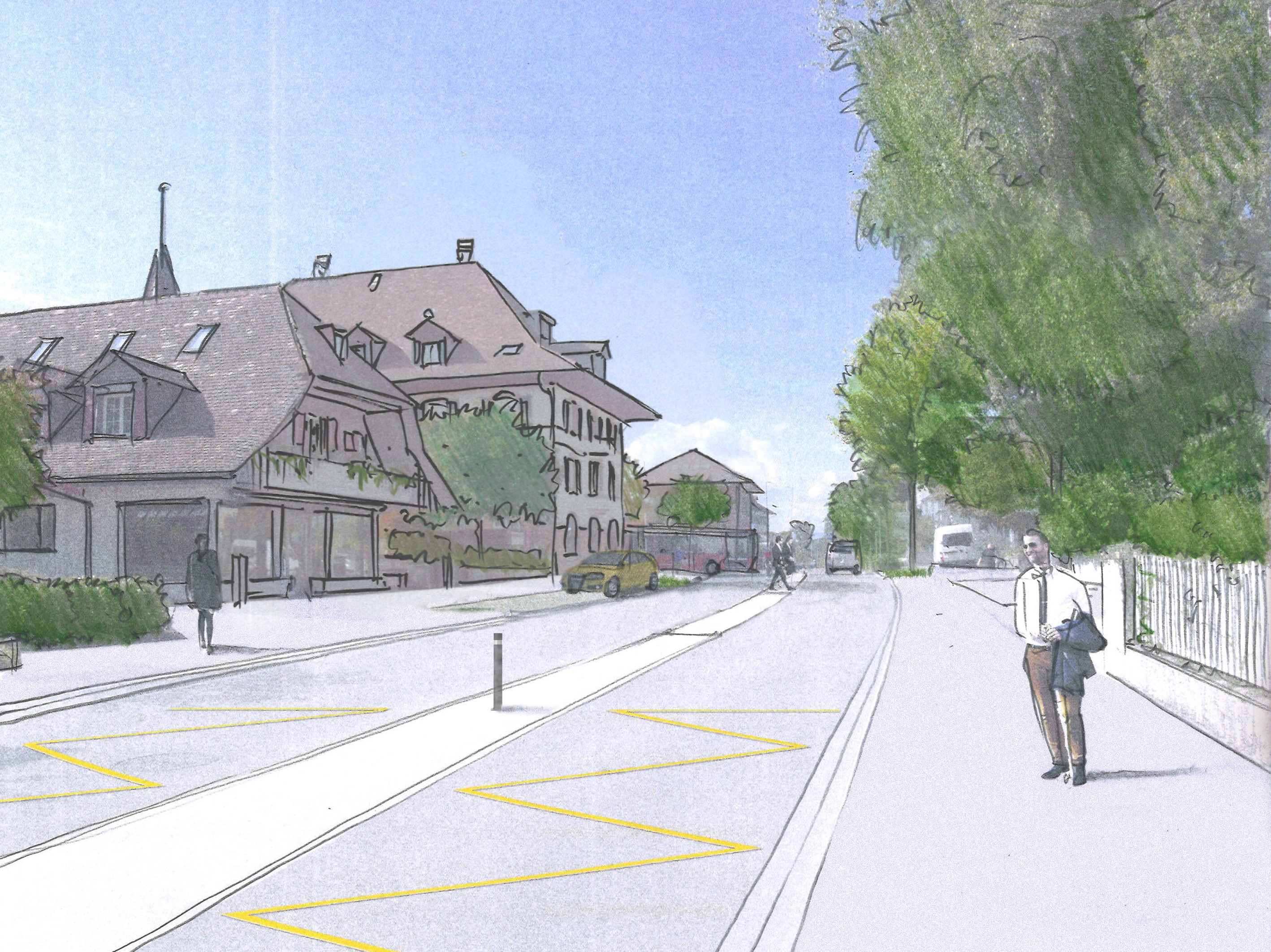 Im nördlichen Abschnitt liegt neu die zentrale Bushaltestelle mit hohen Kanten. Dies ermöglicht einen hindernisfreien Einstieg. Der Bus hält auf der Fahrbahn.